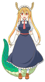 In her human form, Tohru has long blonde hair with flaming orangish tips and red-orange eyes with dilated pupils, and a buxom figure with large thighs and plump, bouncy breasts, claiming to be a D cup (for dragon size). She magically transforms her scales into a maid outfit, copying the compatible from a maid cosplay cafe (Maid Cafe Cozy) after flying to Kobayashi's apartment the first time.