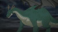 Tohru's dragon form appears every bit a large green European dragon with black wings and a lite green underbelly. The height of her dragon form towers over Kobayashi'southward old flat that's four stories high.